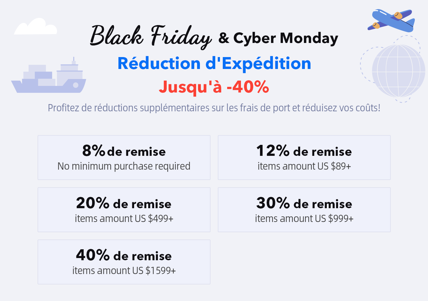 La réduction d'expédition s'applique à toutes les méthodes d'expédition (y compris l'expédition depuis la France).